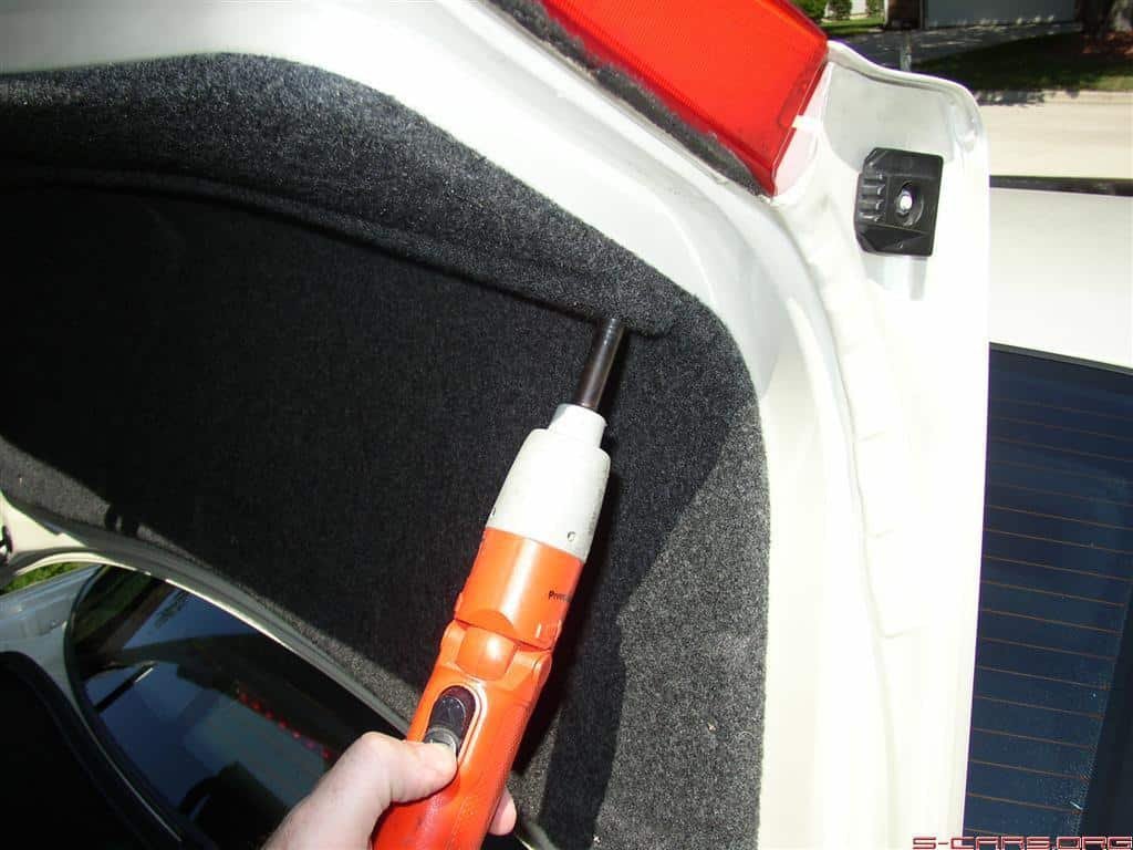 - Loosen the two 8mm nuts holding the trunk lock cylinder in place. Don’t completely remove them yet.