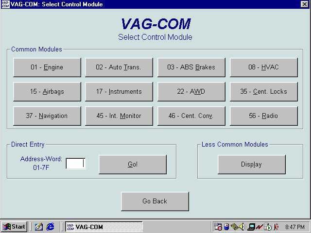 If you have a ’92, verify that the KF14 recall was done on your car. If so, you have an AIRBAG II system. The dealer can tell by your S/N if the recall was done. If not, then let the dealer upgrade your airbag and fix the light for free! Pry the trim piece off that surrounds your HVAC Central Control. BE CAREFUL to go slowly. See the procedure here: HVAC Head Unit Trim Removal. Unscrew the two 4 mm Allen Head screws that hold on the trim piece spring clips. Lift out the central control unit and swing it out so it rest on the passenger seat. Use a flashlight to help you see the AIRBAG triggering unit (labeled as such). Note the connector on the left side of the triggering unit and note the grey foam that is just above the connector. Inside the foam are the two 2-pin connectors that hook up to the VAG-COM. These connectors are identical to the ones under the left side of the hood, used to access fault codes. Push back the foam to connect the VAG-COM. Turn vehicle ignition to ON. Follow the VAG-COM menu to view and clear your fault codes: Menu 1 – Click Select Menu 2 – Click 15 – Airbags