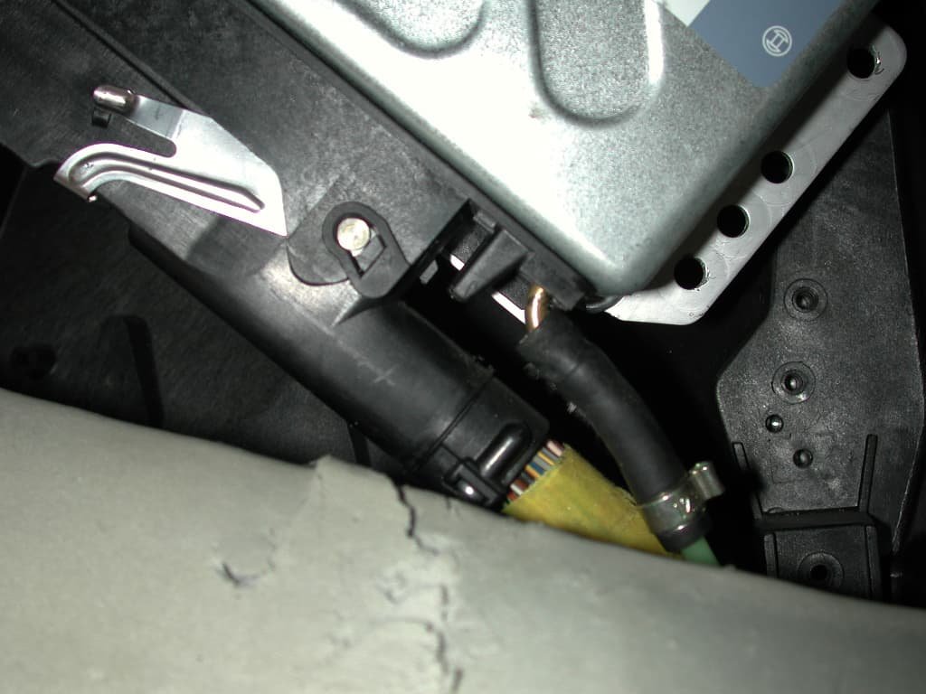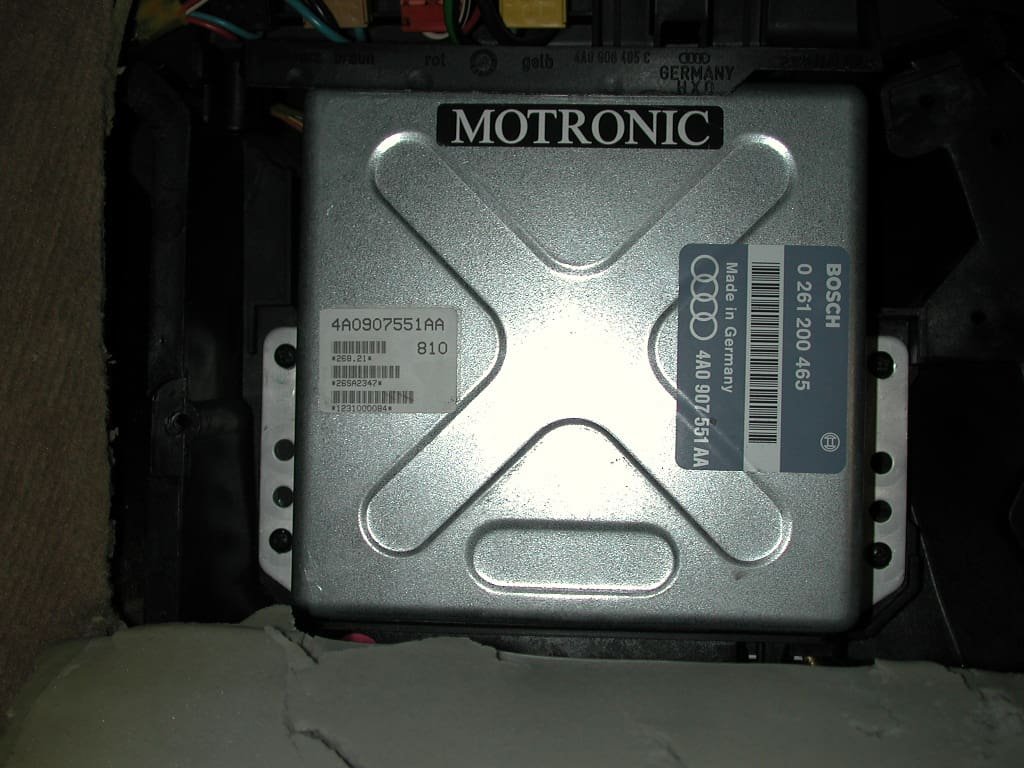 - STEP 5: The Bosch Motronic ECU is held in place with four Phillips screws. Remove the screws and carefully pull the ECU up and out enough to disconnect the manifold pressure hose and the wiring harness.
